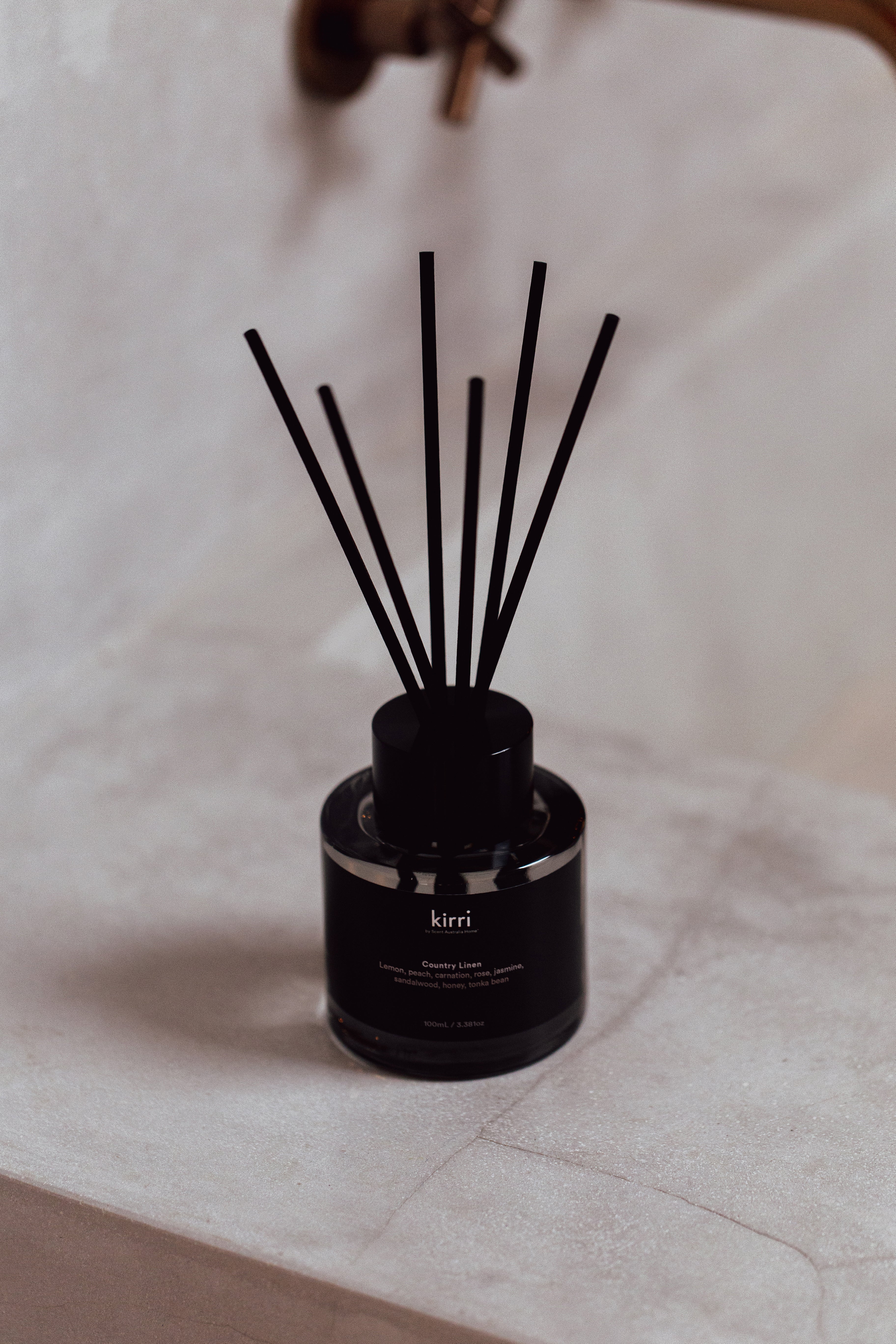 The 100ml reed diffuser is presented in a weighted glass vessel with a refined metal collar, an understated detail that elevates the form while anchoring it within the space. Each diffuser includes a full set of natural reeds for optimal scent dispersion.